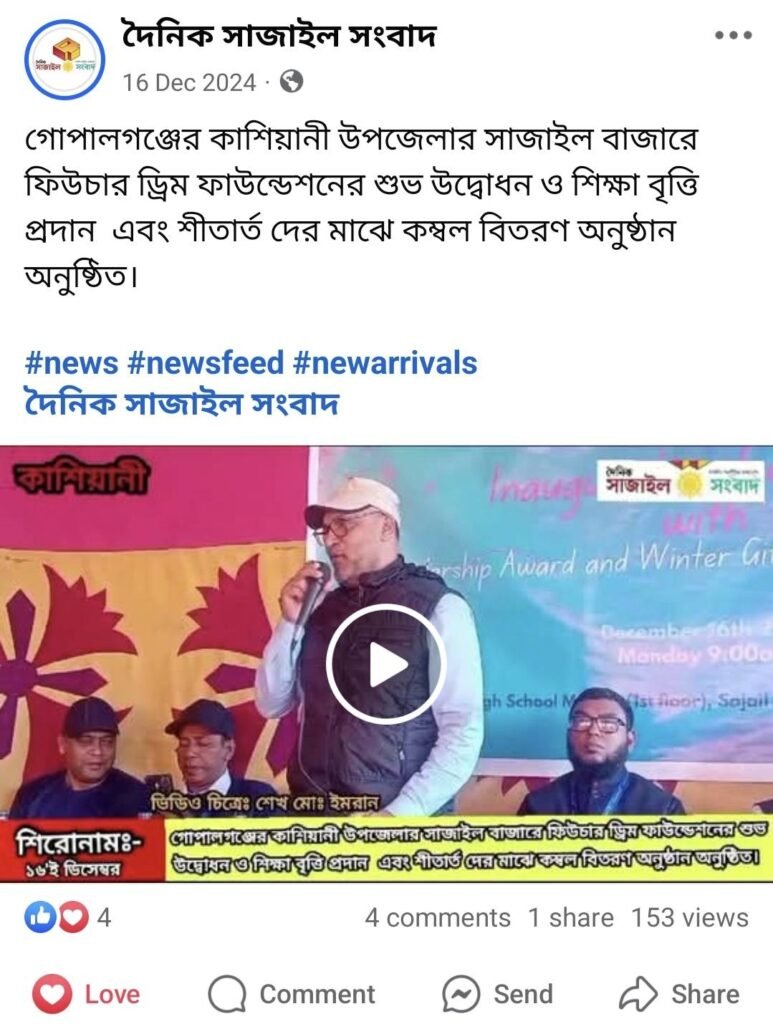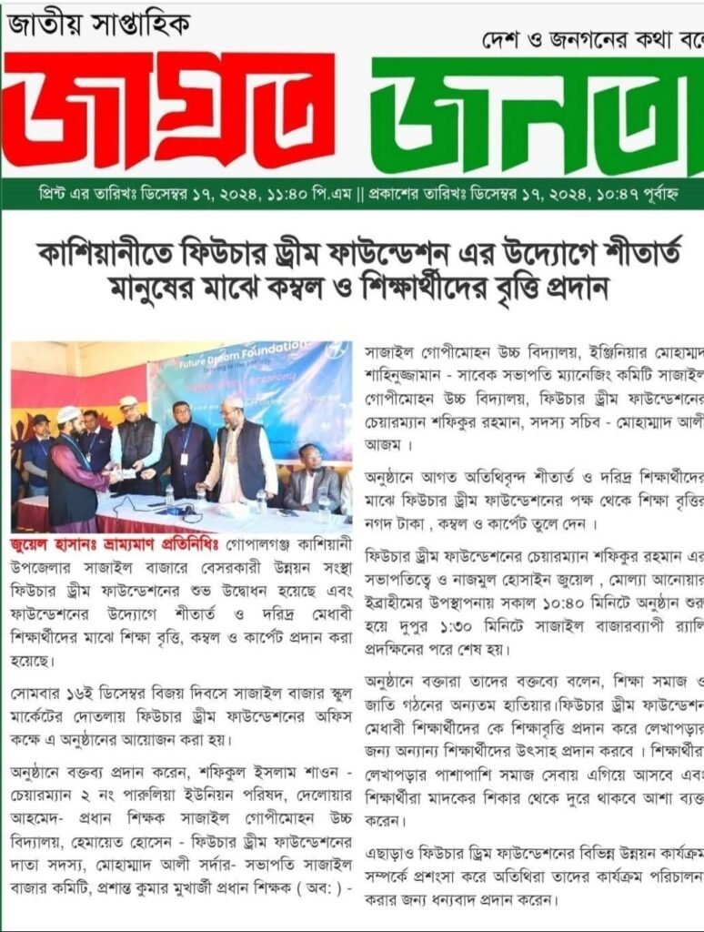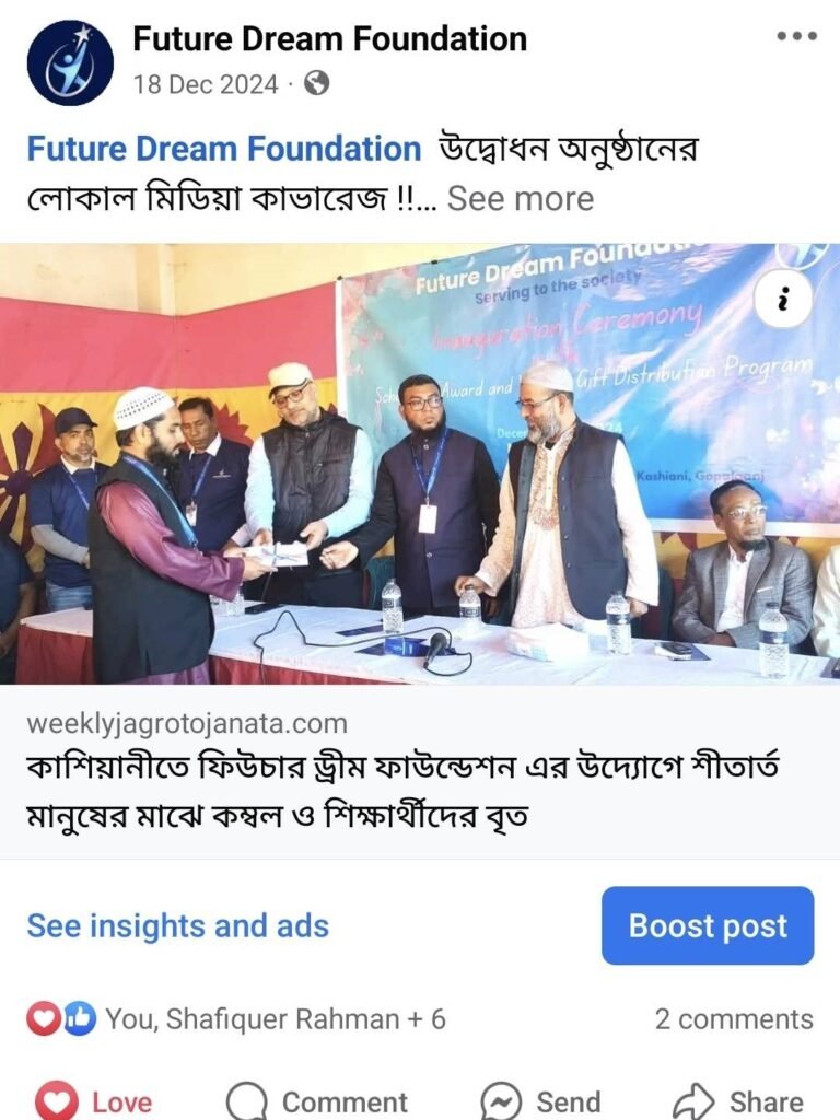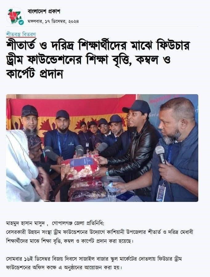 Welfare. Future Dream Foundation is a charitable organization formed and managed by the alumni of Sajail Gopi Mohan High School. On